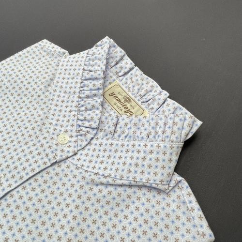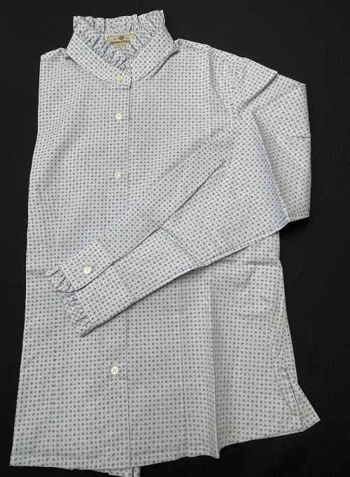 スタンドカラーの襟と袖口にフリルをあしらったブラウスです。