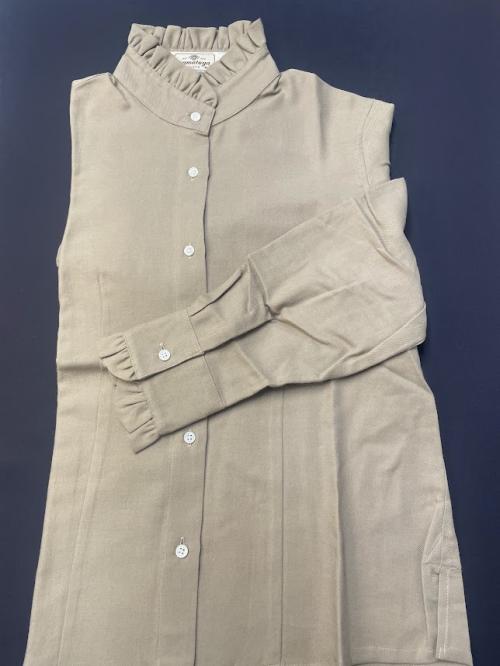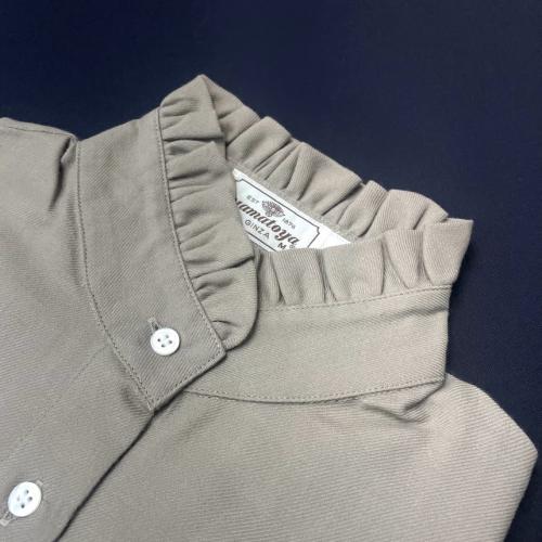 スタンドカラーの襟と袖口にフリルをあしらったブラウスです。