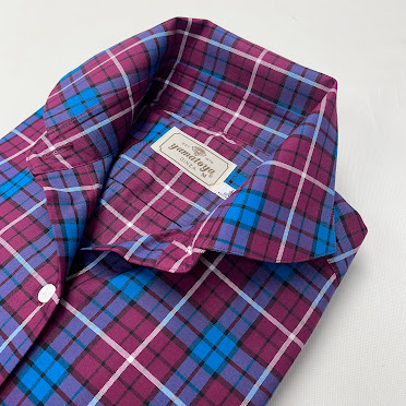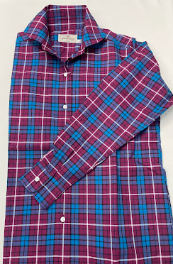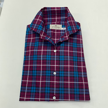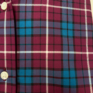 鮮やかなブルーとワインレッドの大胆ながら落ち着いたチェックのブラウスです。