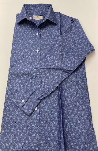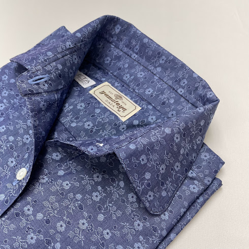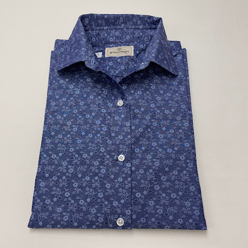 デニムカラーに小花柄の織柄が上品な印象のブラウスです。