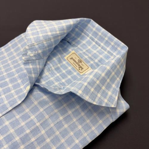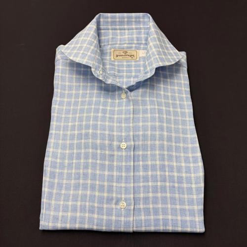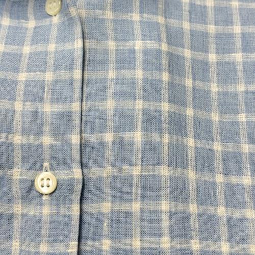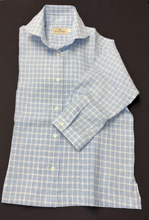 涼しげなブルー地に白格子の麻100%ブラウス。