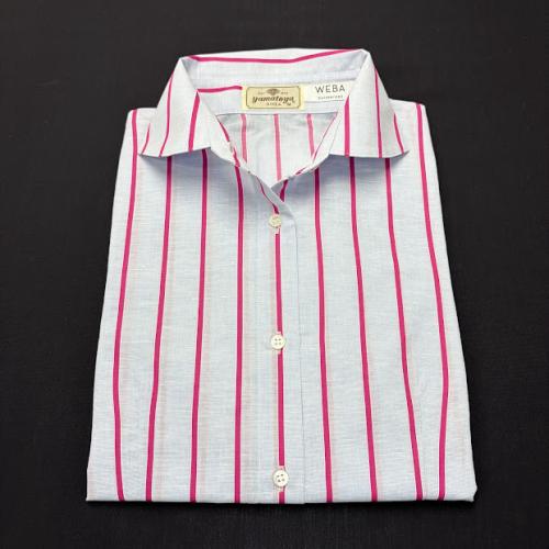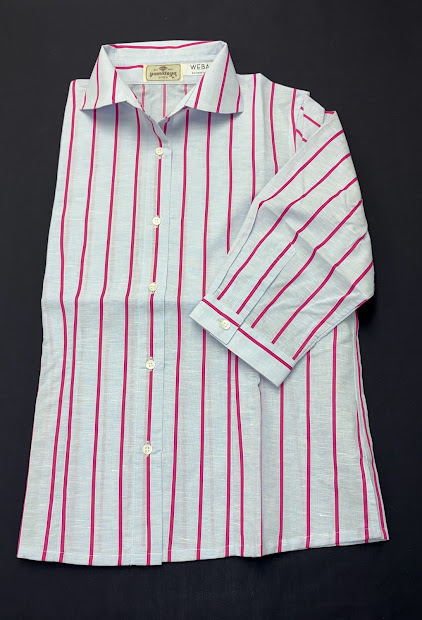 婦人 綿麻ブルー地ピンクストライプ(LL)(七分袖)