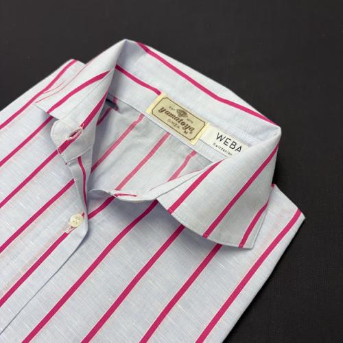 涼しげなブルー地にピンクのストライプが効いています。
